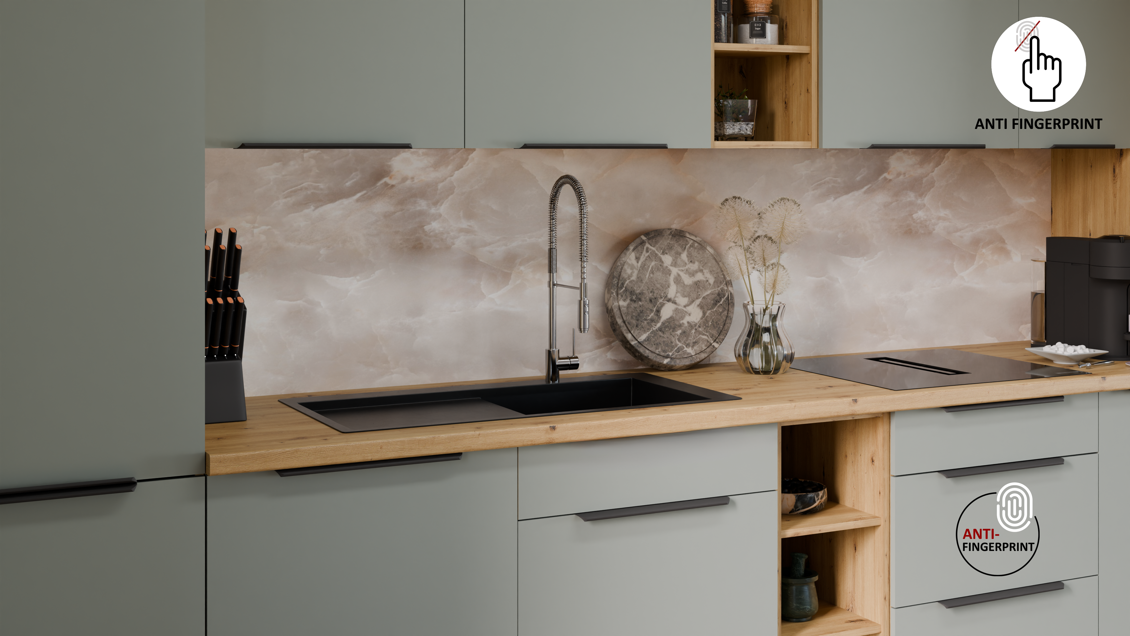 CALIA to nowoczesna kolekcja mebli kuchennych, łącząca styl, funkcjonalność i najwyższą jakość wykonania. Jej największym wyróżnikiem są fronty pokryte innowacyjną powłoką ANTI-FINGERPRINT, która skutecznie ogranicza powstawanie śladów palców. Dzięki niej powierzchnie mebli pozostają czyste i estetyczne na dłużej, a matowe wykończenie frontów nadaje im elegancki, nowoczesny charakter.
