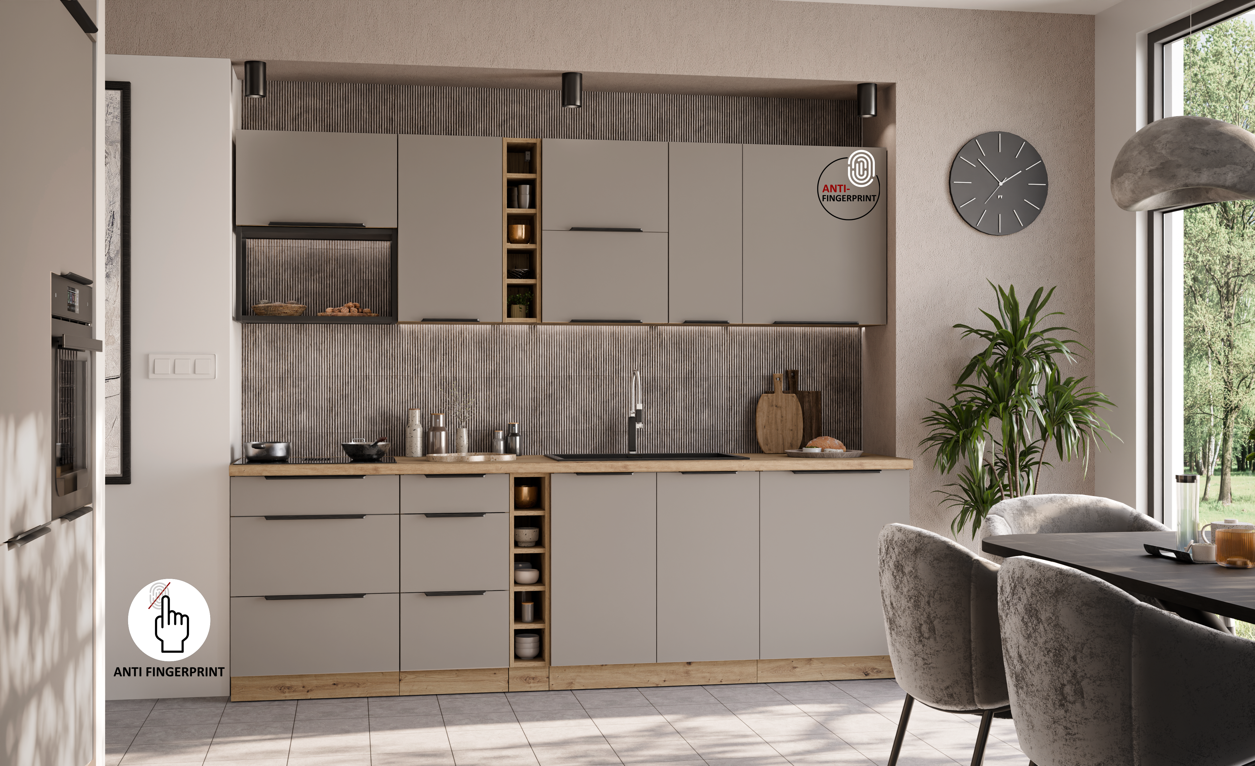 ☑️ Fronty z powłoką ANTI-FINGERPRINT – nowoczesna technologia, która skutecznie ogranicza ślady palców i ułatwia utrzymanie mebli w idealnej czystości. Matowe wykończenie nadaje frontom elegancki wygląd i sprawia, że są przyjemne w dotyku.