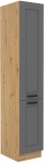 Front w matowym, ciemnoszarym odcieniu z frezem, czarne uchwyty i korpus w kolorze dębu artisan tworzą nowoczesną i ciepłą kompozycję. Wnętrze oferuje dużą ilość miejsca przy niewielkiej szerokości frontu. Komfort użytkowania zapewnia system cichego domyku.