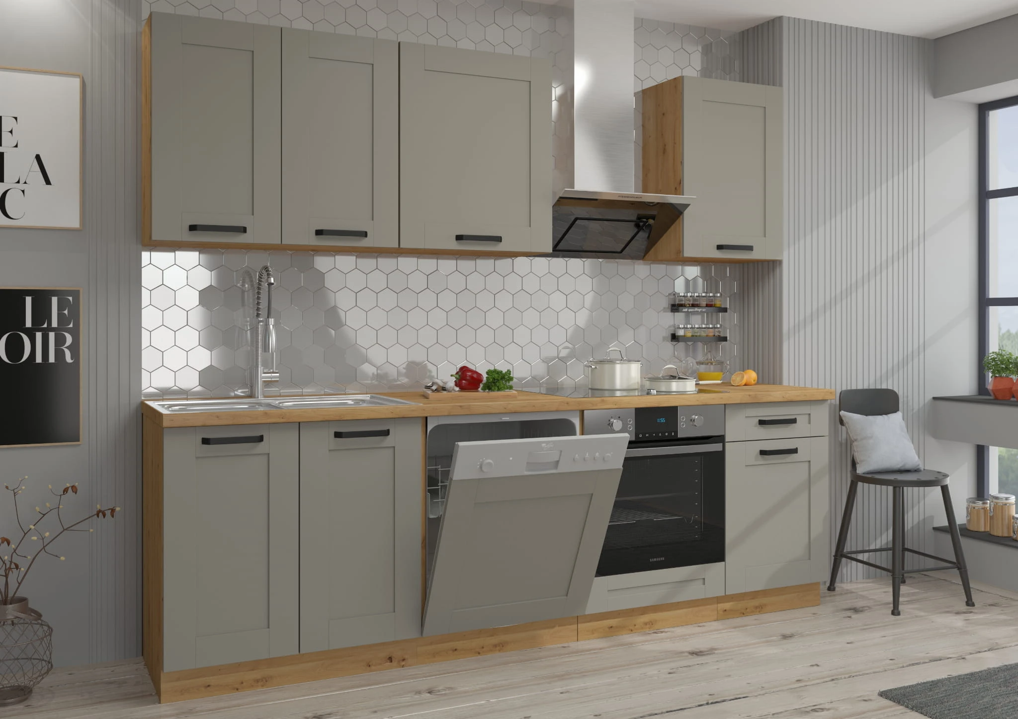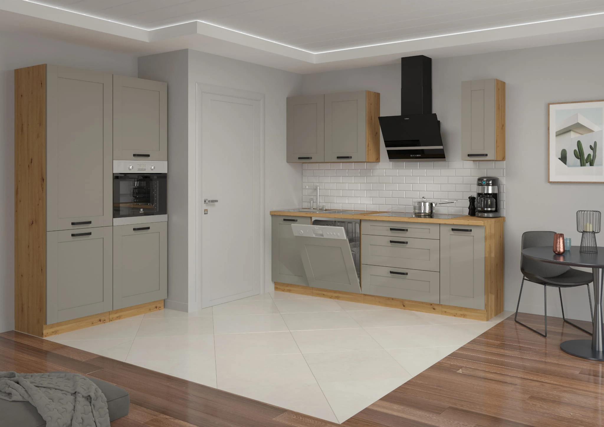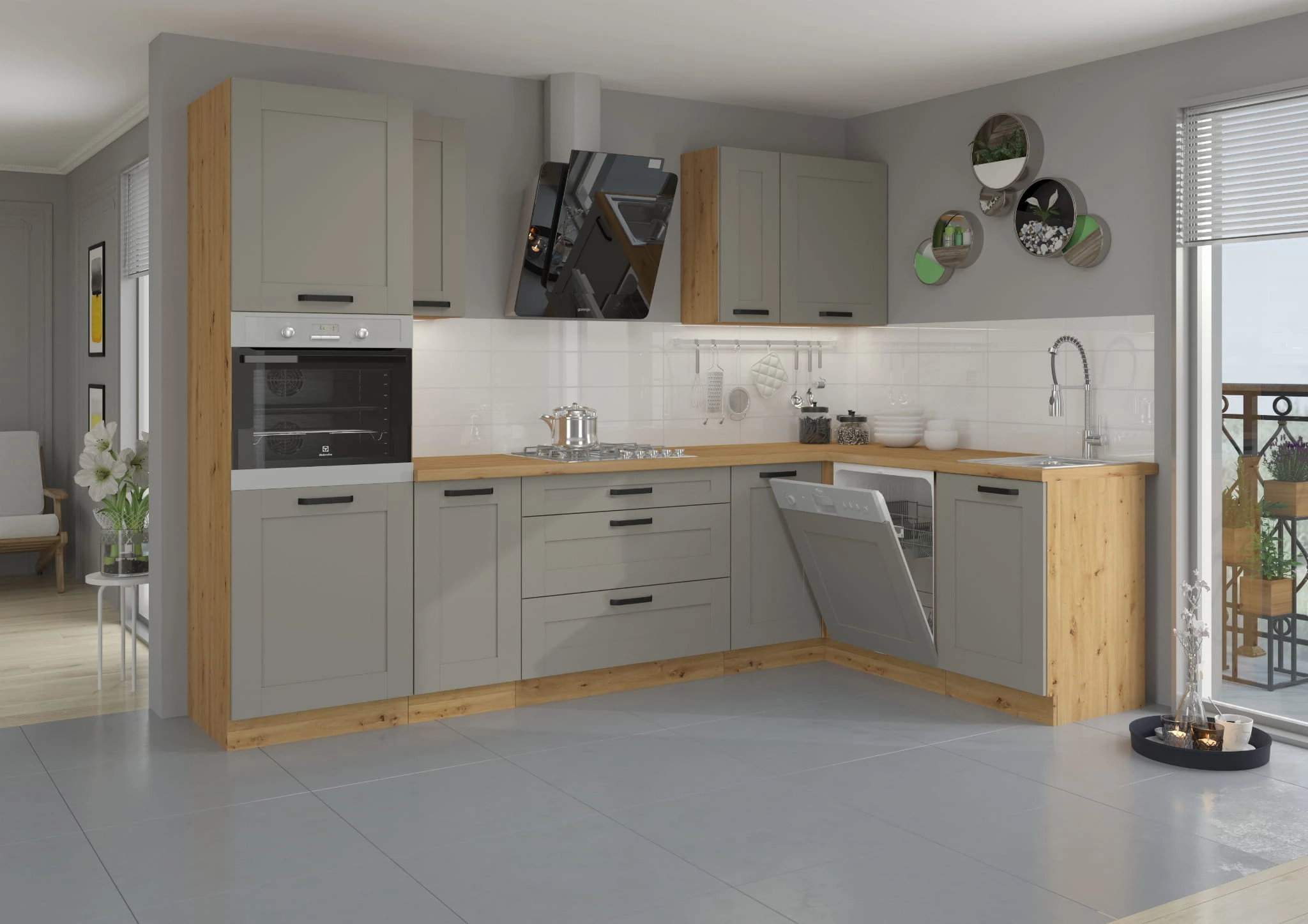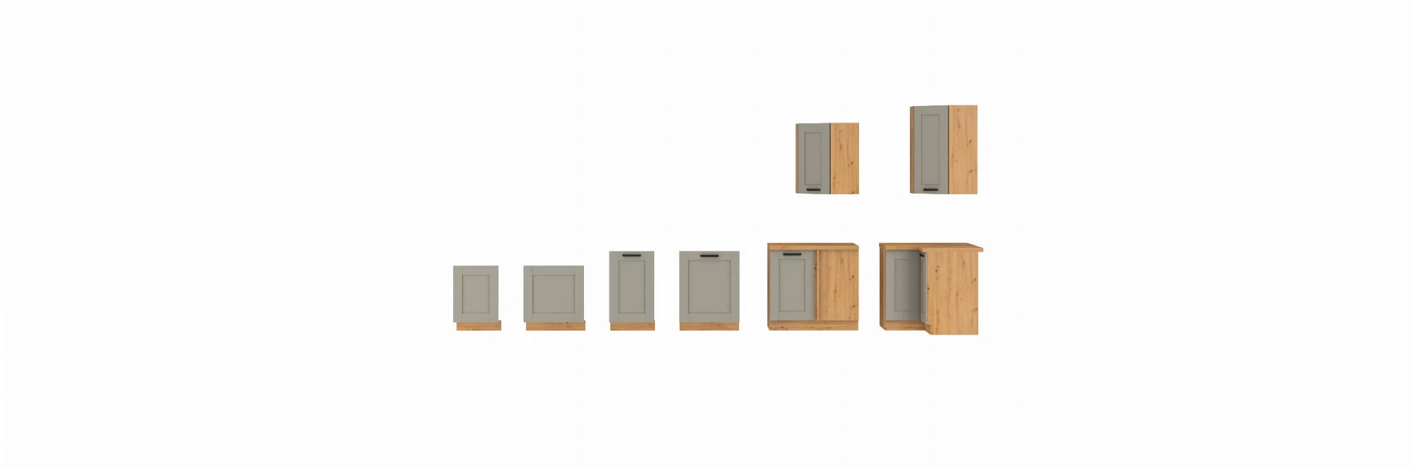 Fronty wykonane z jasnoszarego MDF w matowym wykończeniu z dekoracyjnym frezowaniem nadają elegancji, a korpus w kolorze dąb artisan wprowadza ciepło i naturalny wygląd. Solidne zawiasy z cichym domykiem zapewniają wygodę i trwałość użytkowania, a czarne uchwyty dodają nowoczesnego charakteru.