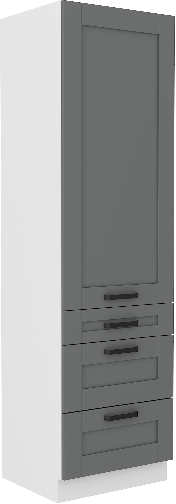 Model LILA 60 DKS-210 3S 1F to wysoka szafka do zabudowy kuchennej z trzema dolnymi szufladami oraz frontem górnym, który pozwala na przechowywanie większych sprzętów, garnków lub zapasów.
