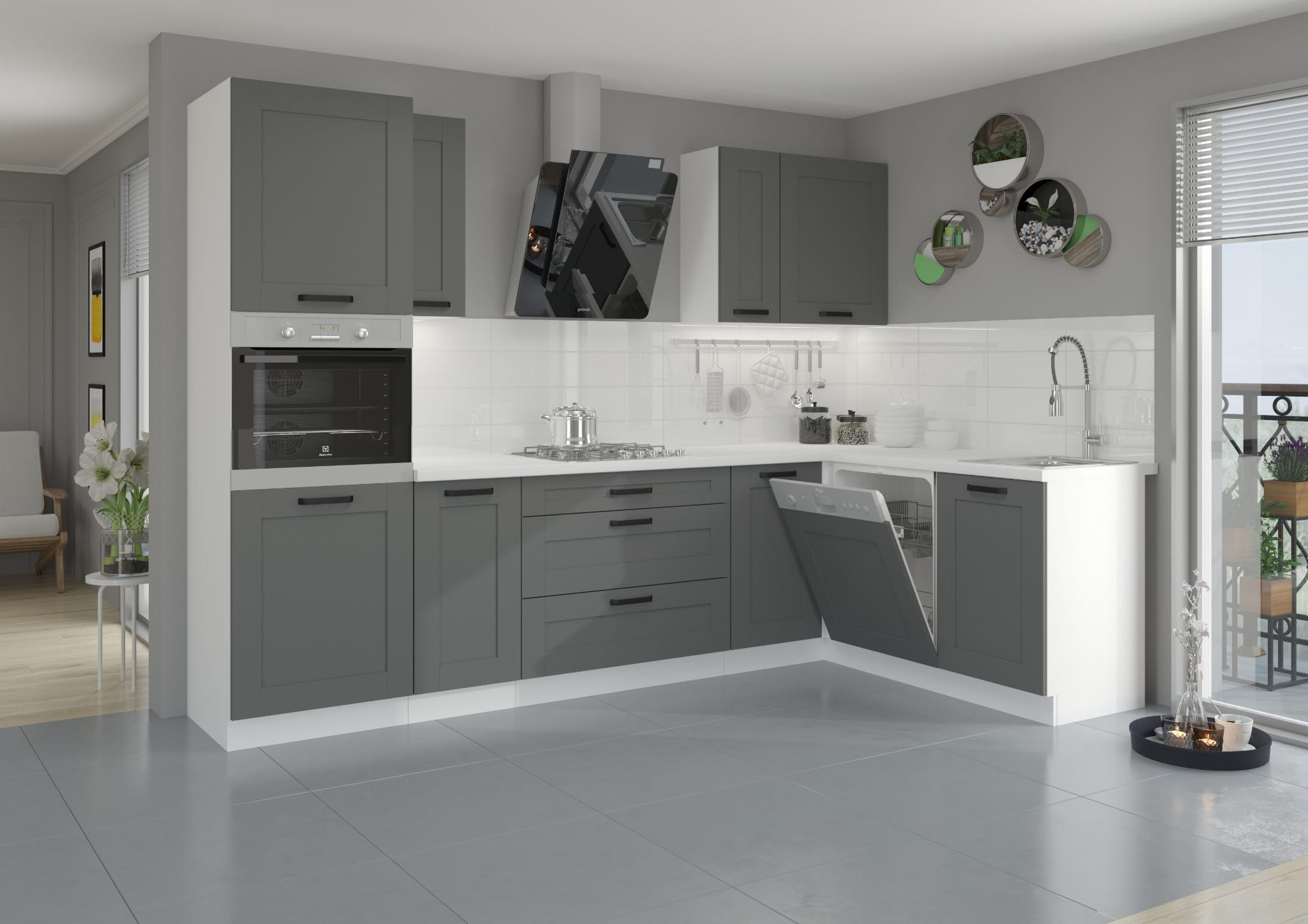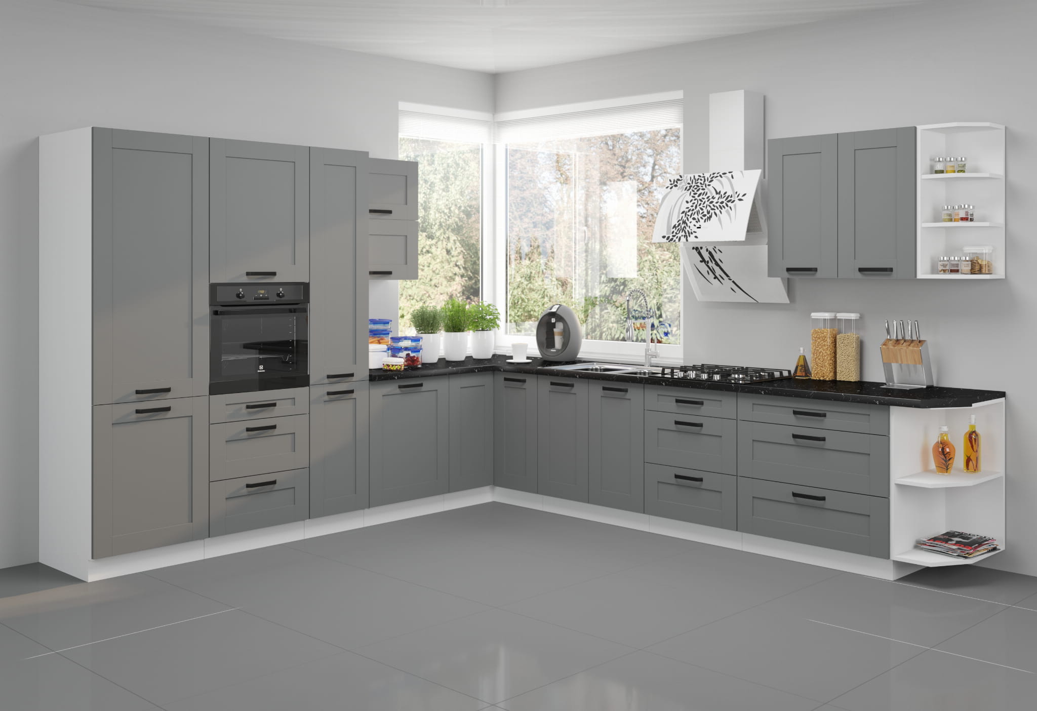 Dzięki systemowi cichego domyku i prowadnicom PREMIUM BOX, codzienne korzystanie z szafki jest niezwykle wygodne. A ciemnoszare, frezowane fronty w macie wraz z białym korpusem i czarnymi uchwytami nadają całości eleganckiego, współczesnego charakteru.