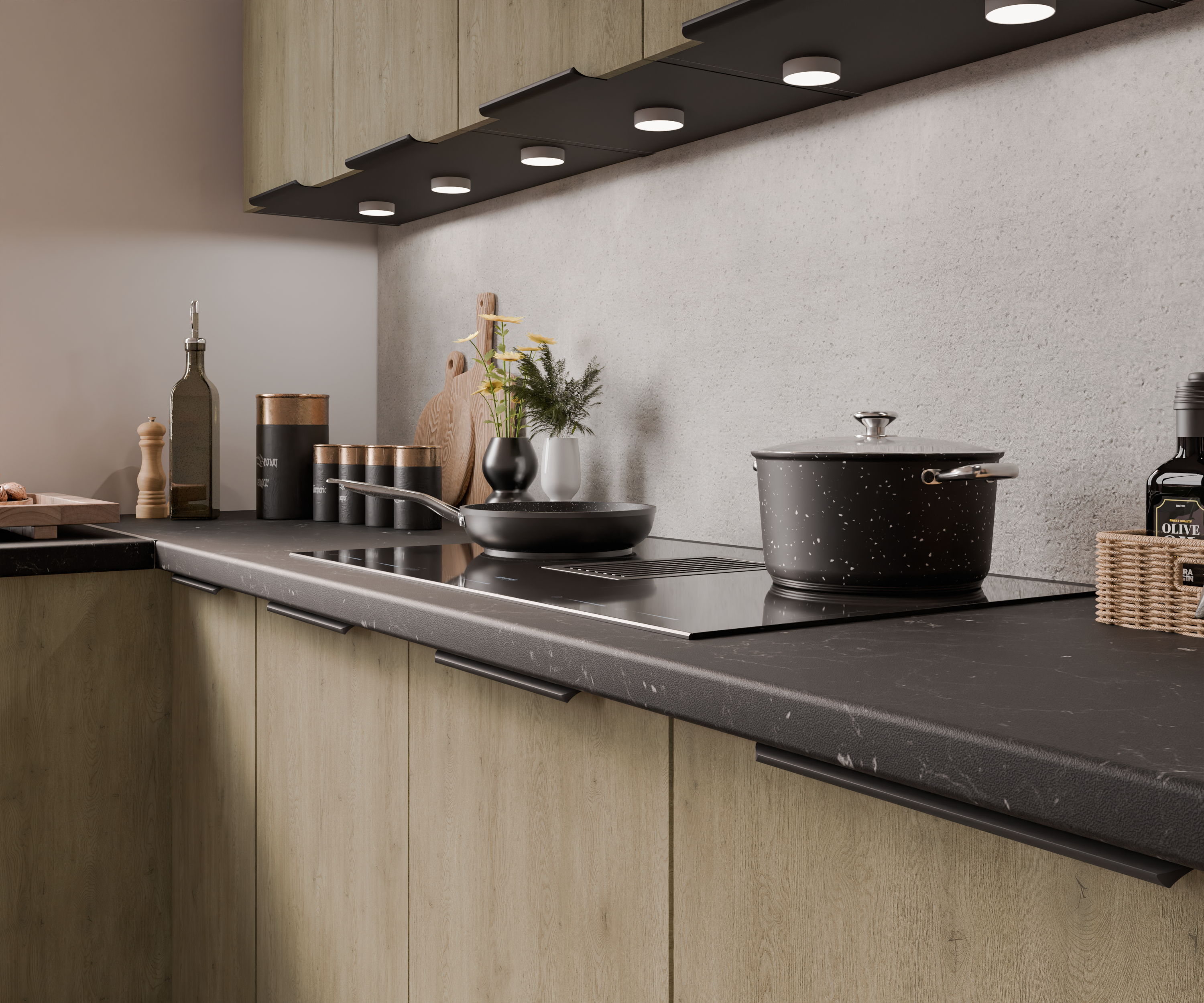 ☑️ Nowoczesny design – matowe fronty w kolorze Dąb Cremona w połączeniu z czarnym korpusem i uchwytem krawędziowym UA-HEXA z aluminium tworzą wyrafinowany, a zarazem ponadczasowy wygląd.