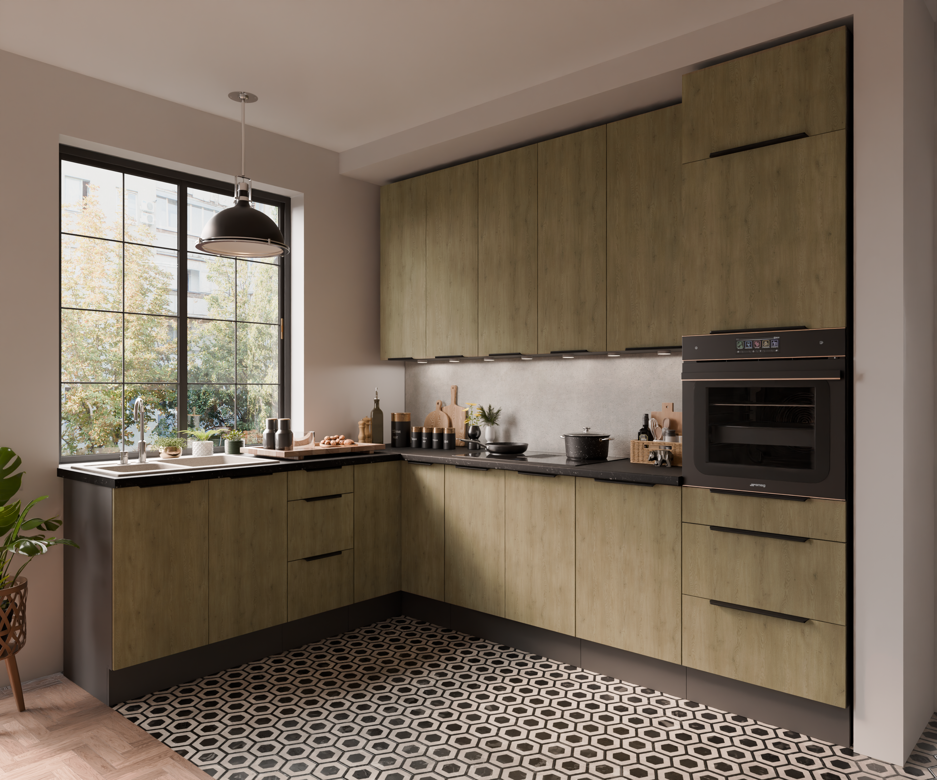Kolekcja mebli kuchennych LUME łączy nowoczesną prostotę z przytulnym charakterem drewna. Jasne, matowe fronty o strukturze przypominającej drewno świetnie komponują się z korpusem szafki w kolorze antracytu, nadając wnętrzu elegancki i ponadczasowy wygląd. Proste uchwyty i wyraźne linie podkreślają nowoczesny styl zestawu, a dobrze zaplanowany układ szafek pozwala maksymalnie wykorzystać przestrzeń – także w mniejszych kuchniach.