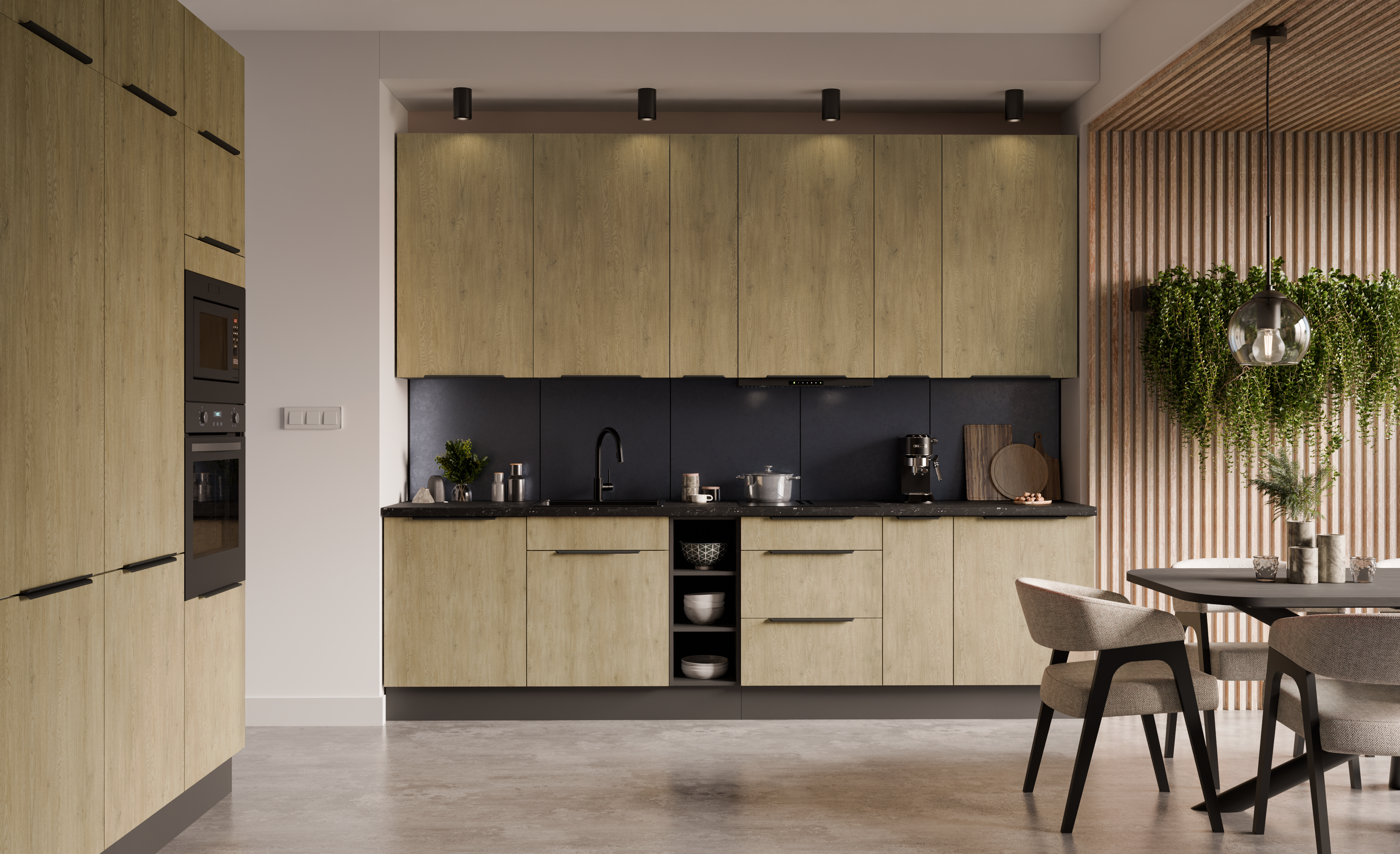 Kolekcja mebli kuchennych LUME łączy nowoczesną prostotę z przytulnym charakterem drewna. Jasne, matowe fronty o strukturze przypominającej drewno świetnie komponują się z korpusem szafki w kolorze antracytu, nadając wnętrzu elegancki i ponadczasowy wygląd. Proste uchwyty i wyraźne linie podkreślają nowoczesny styl zestawu, a dobrze zaplanowany układ szafek pozwala maksymalnie wykorzystać przestrzeń – także w mniejszych kuchniach.