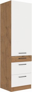 Słupek wyposażony w trzy pojemne szuflady oraz jeden front ułatwia ergonomiczne przechowywanie kuchennych akcesoriów. Szuflady umożliwiają szybki dostęp do często używanych przedmiotów, natomiast półki za frontem pomieszczą większe zapasy. To mebel, który zwiększa funkcjonalność każdej kuchni.