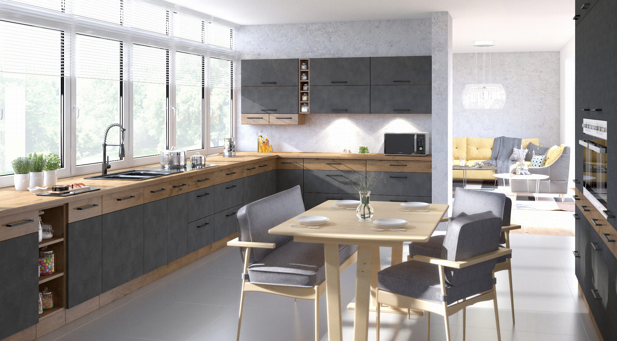 ☑️ Kolekcja mebli kuchennych SARA łączy elegancki odcień matera mat z naturalnym urokiem dekoru dąb lancelot, tworząc nowoczesną i przytulną przestrzeń kuchenną. Modułowa konstrukcja szafek pozwala dowolnie aranżować układ zabudowy, dopasowując go do każdego wnętrza. System cichego domyku i prowadnice PREMIUM BOX zapewniają płynne, komfortowe użytkowanie każdego dnia..