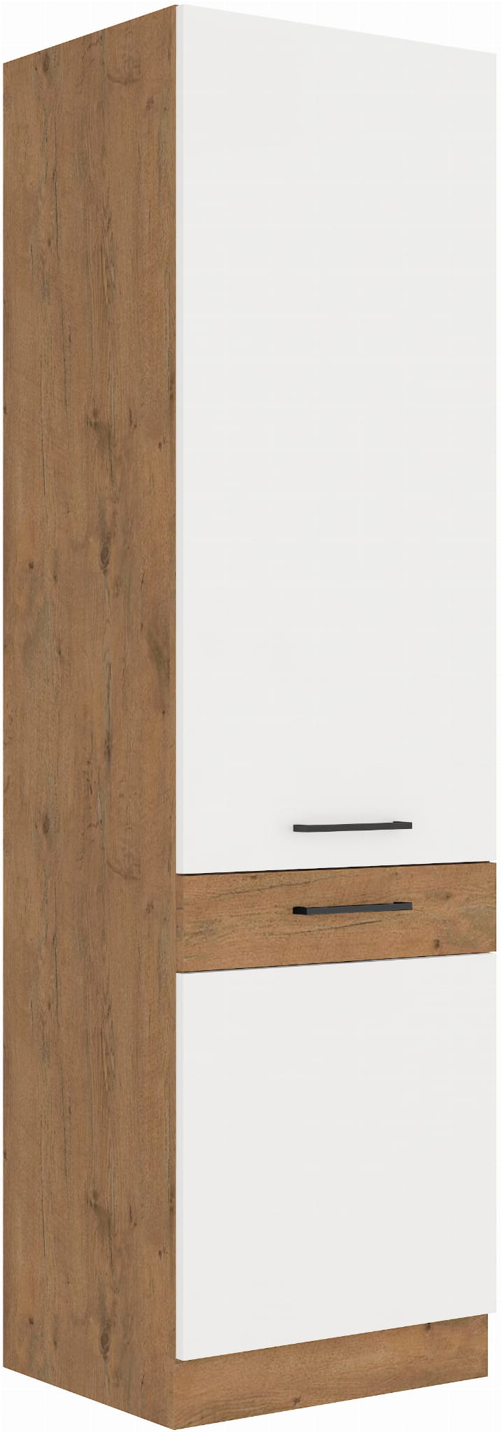 Ta szafka pozwala na estetyczną zabudowę lodówki, tworząc spójny wygląd całej kuchni. Dwa fronty ułatwiają dostęp i dopasowanie do reszty mebli. Rozwiązanie to zwiększa funkcjonalność i nadaje wnętrzu nowoczesny charakter.