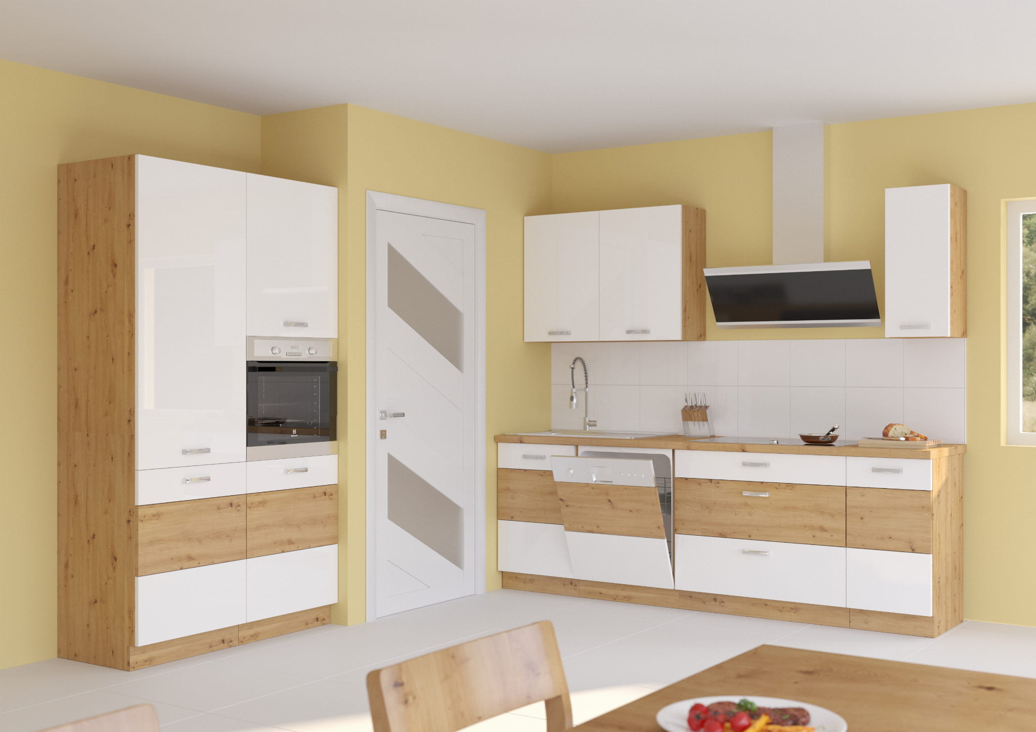 Kolekcja mebli kuchennych VICTORIA łączy naturalne ciepło drewna z nowoczesnym białym połyskiem. Fronty w połączeniu matowego dębu artisan i bieli w wysokim połysku tworzą elegancki, a zarazem przytulny charakter wnętrza. Drewniany korpus w kolorze dębu artisan harmonijnie dopełnia całość, a subtelne, metalowe uchwyty w srebrnym macie podkreślają nowoczesną linię kuchni.