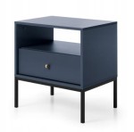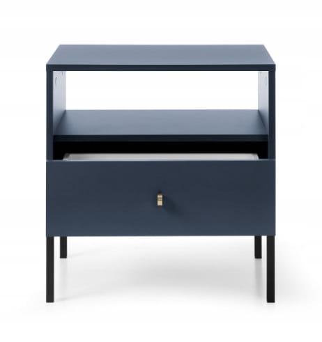 Stolik nocny SZAFIR to doskonałe połączenie nowoczesnego designu z nutą elegancji. Głęboki granatowy kolor w połączeniu z czarnym stelażem i uchwytami nadaje mu wyrafinowanego charakteru. Meble z tej kolekcji łączą elegancję z funkcjonalnością. Szafka nocna ,, SZAFIR'' posiada jedną pojemną szufladę.