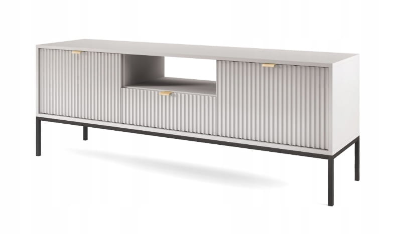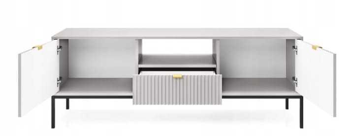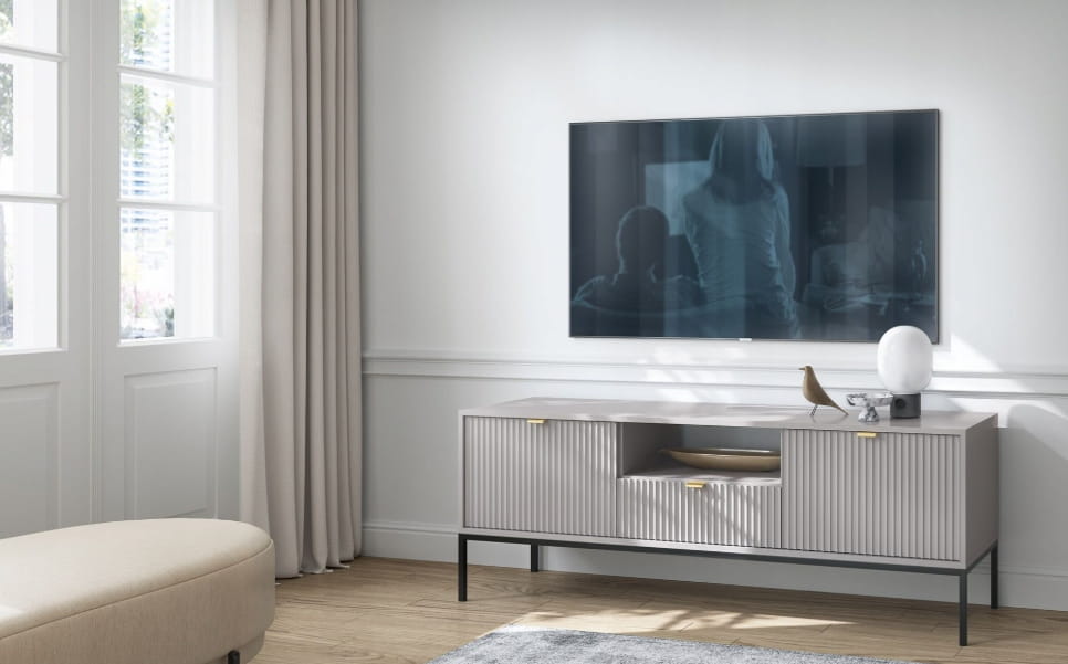 Szafka RTV 2D z szufladą ZANZI sprawdzi się zarówno w nowoczesnych, jak i klasycznych wnętrzach, dodając im wyrafinowanego stylu. Dzięki frezowanym frontom mebel zyskuje dynamiczną strukturę, która odświeża wygląd wnętrza, nadając mu wyjątkowy charakter. Smukłe, wysokie nogi na stelażu nadają stolikowi kawowemu szyku a zarazem ułatwiają utrzymanie porządku.