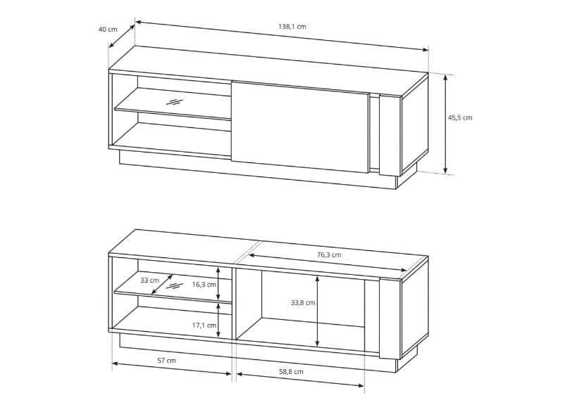 - Funkcjonalna i efektowna - szafka wyposażona jest w szklaną półkę na dekodery ( do której istnieje możliwość dokupienia oświetlenia LED) oraz w przestronne miejce do chowania dokumentów, książek, sprzętów elektronicznych czy innych przedmiotów.