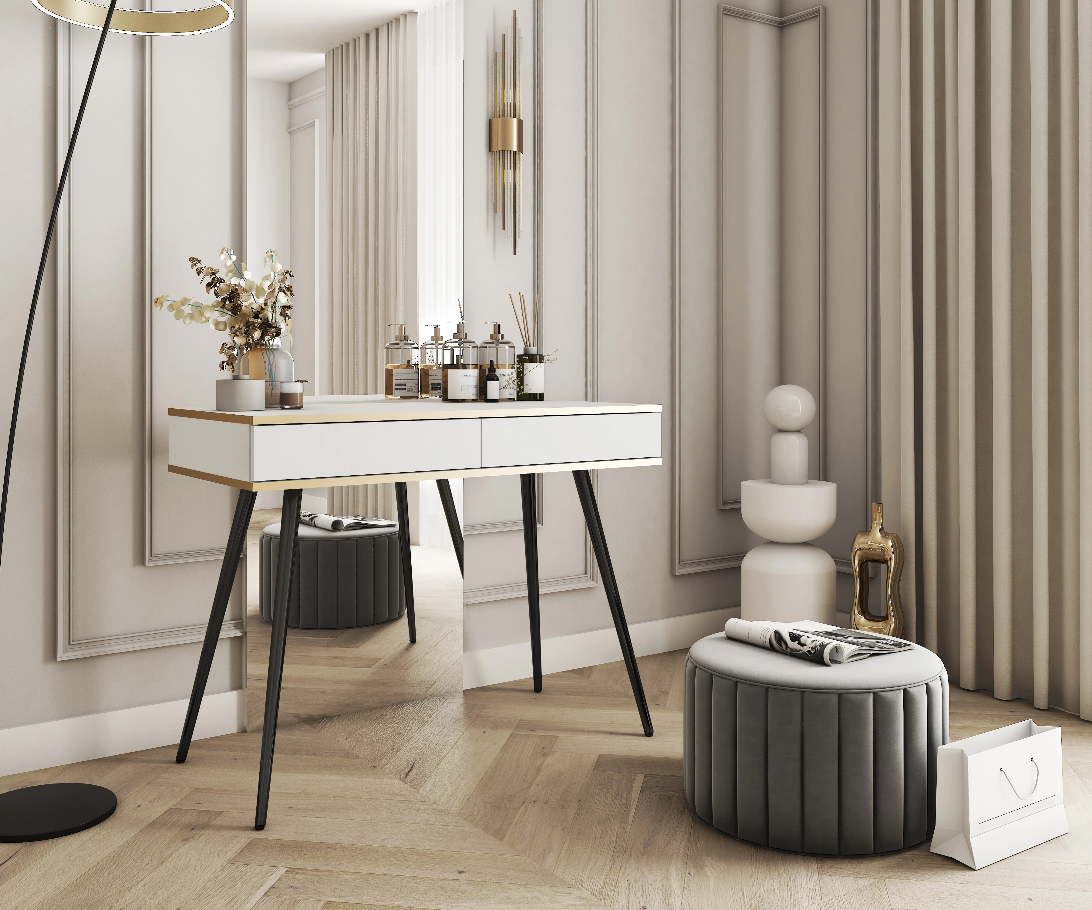 Toaletka Aurezzia 102 cm to elegancki element wyposażenia sypialni, który łączy nowoczesny styl z wygodą użytkowania. Jasne fronty i złote zdobienia nadają wnętrzu lekkości, a czarne nogi wprowadzają wyrazisty akcent, który podkreśla charakter aranżacji. Toaletka tworzy idealne miejsce do przechowywania kosmetyków i akcesoriów, co ułatwia codzienną pielęgnację.