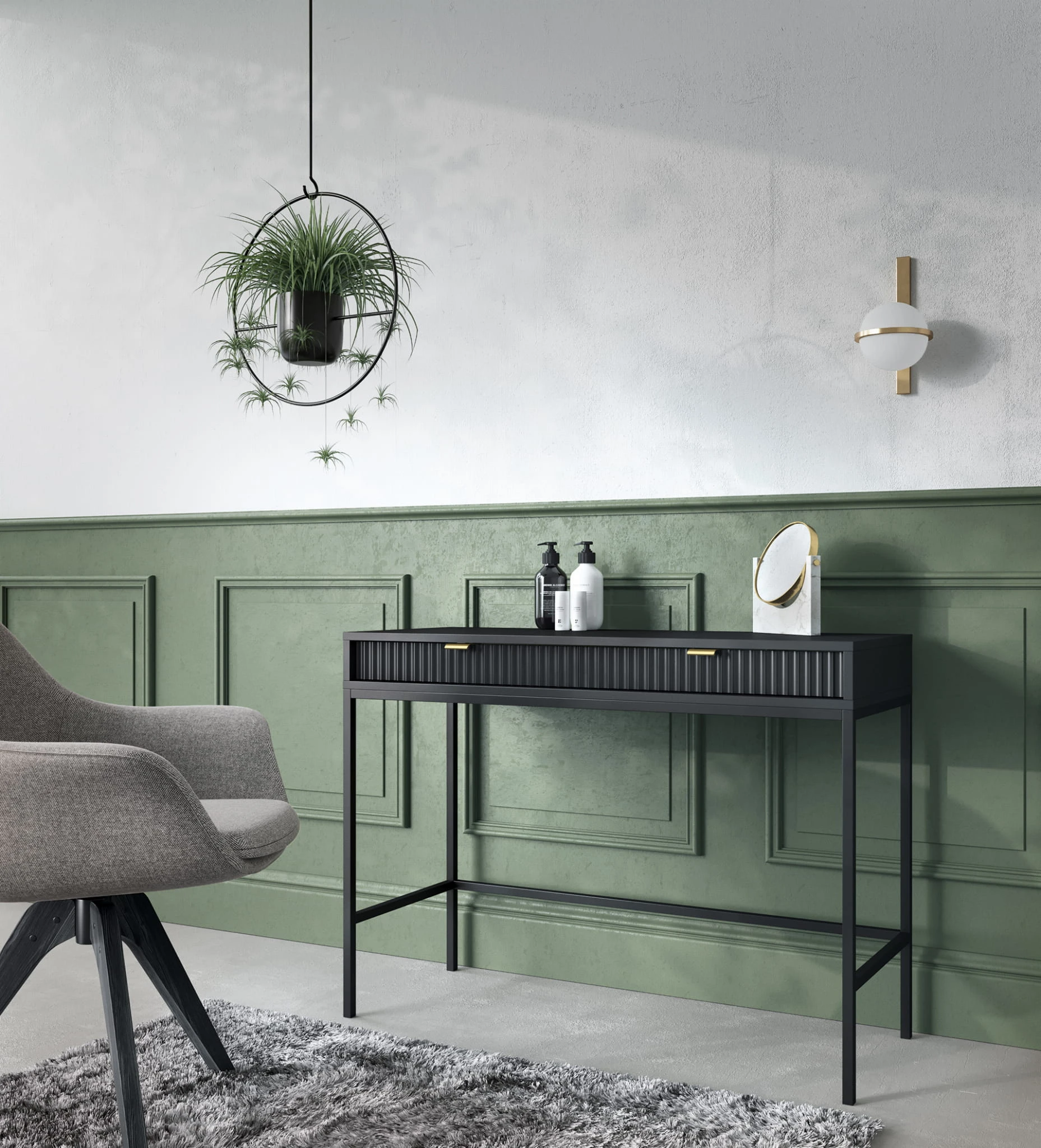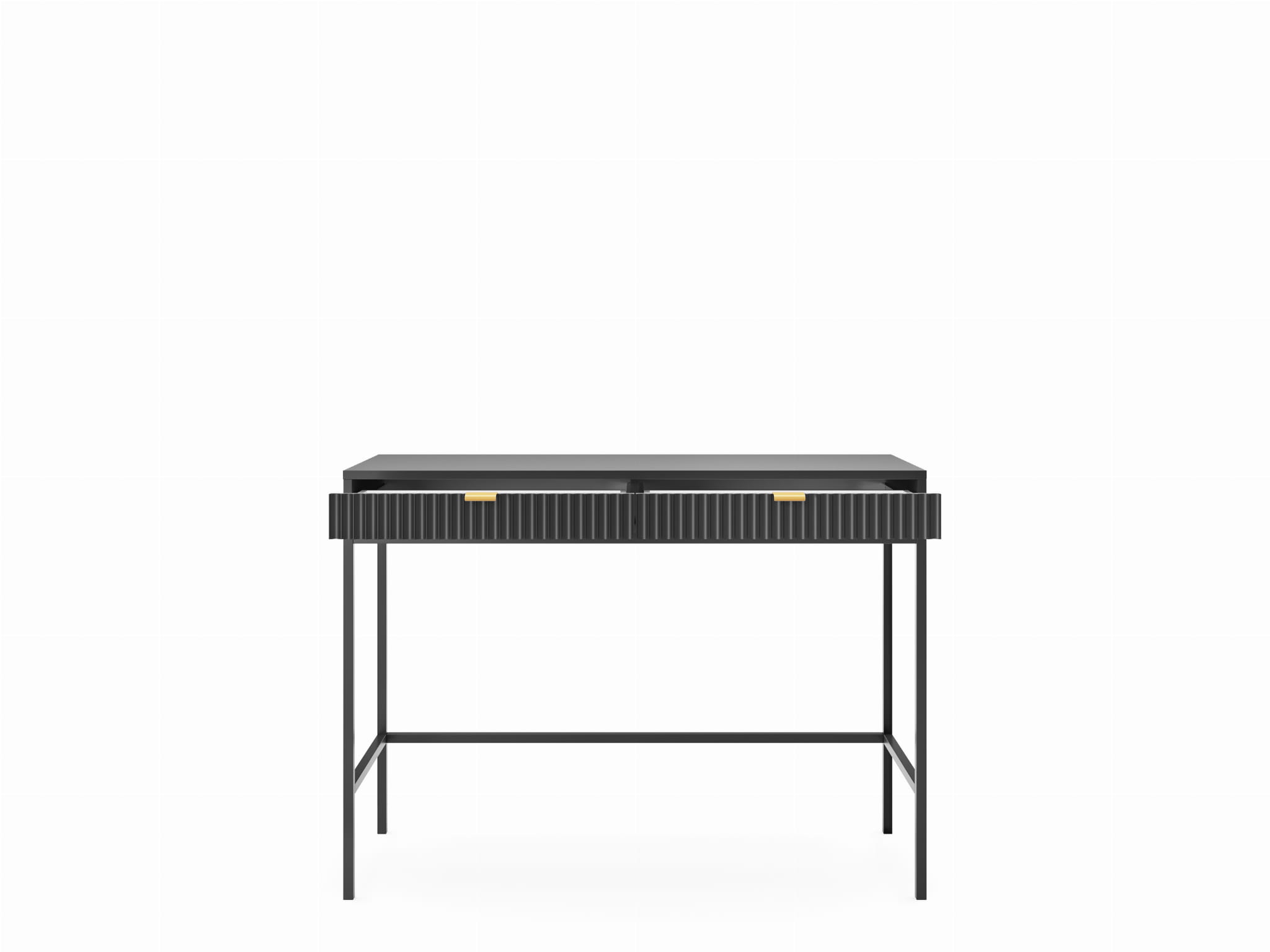 Toaletka z szufladami ZANZI sprawdzi się zarówno w nowoczesnych, jak i klasycznych wnętrzach, dodając im wyrafinowanego stylu. Dzięki frezowanym frontom mebel zyskuje dynamiczną strukturę, która odświeża wygląd wnętrza, nadając mu wyjątkowy charakter. Smukłe, wysokie nogi na stelażu nadają toaletce szyku a zarazem ułatwiają utrzymanie porządku.