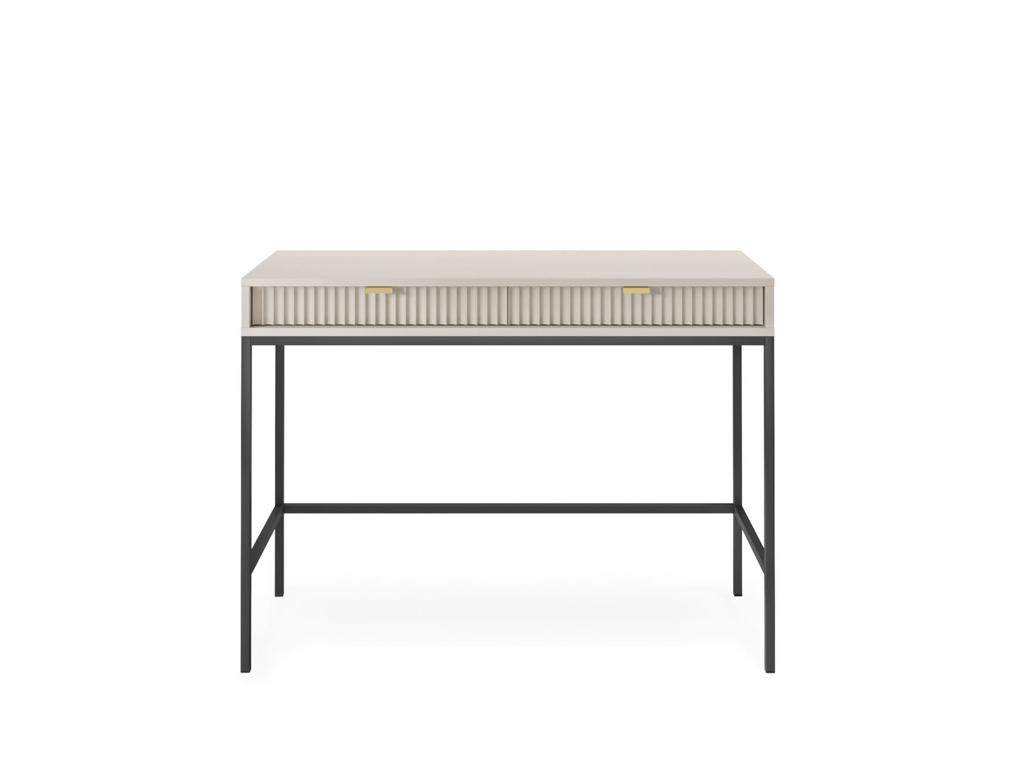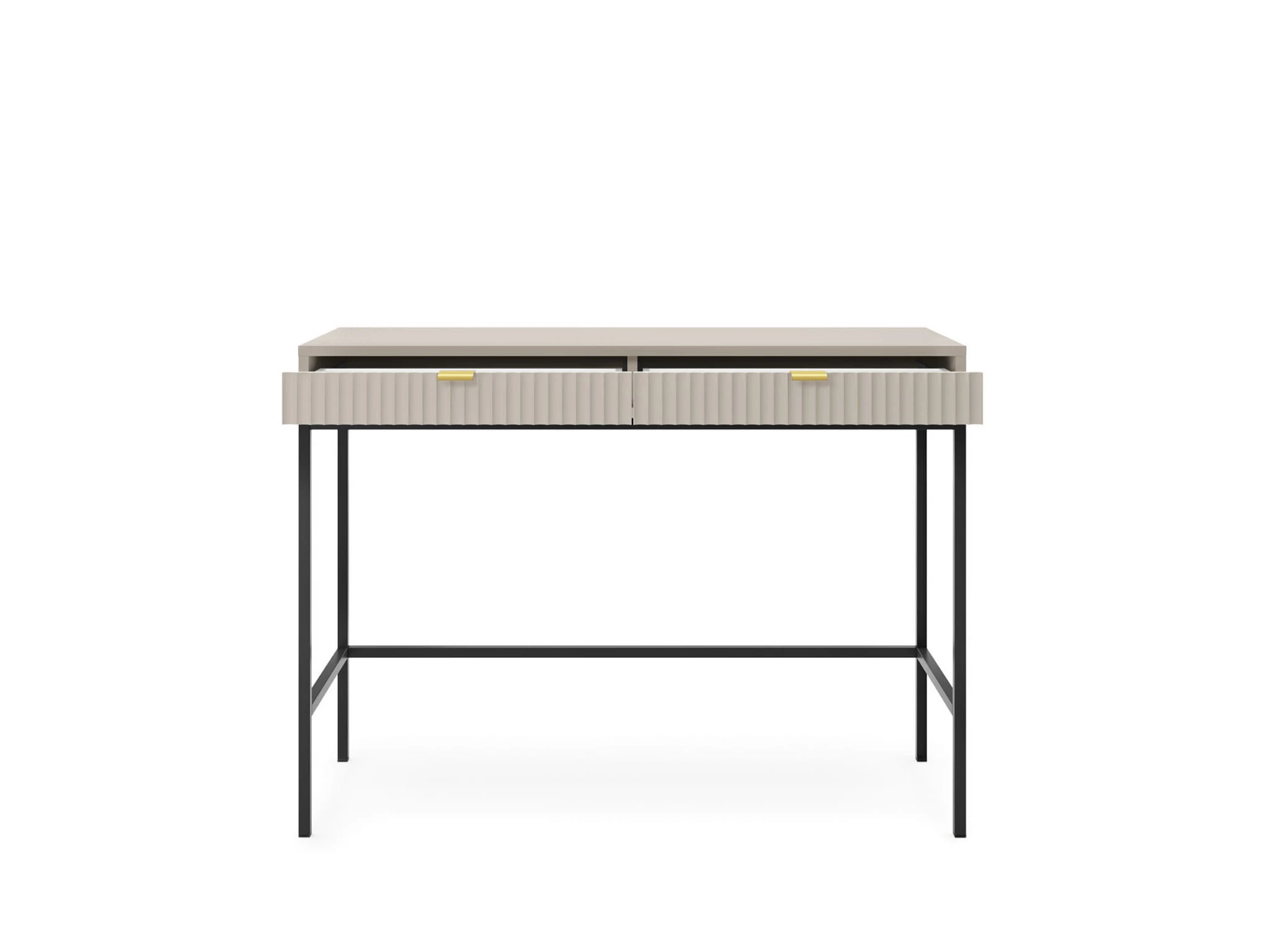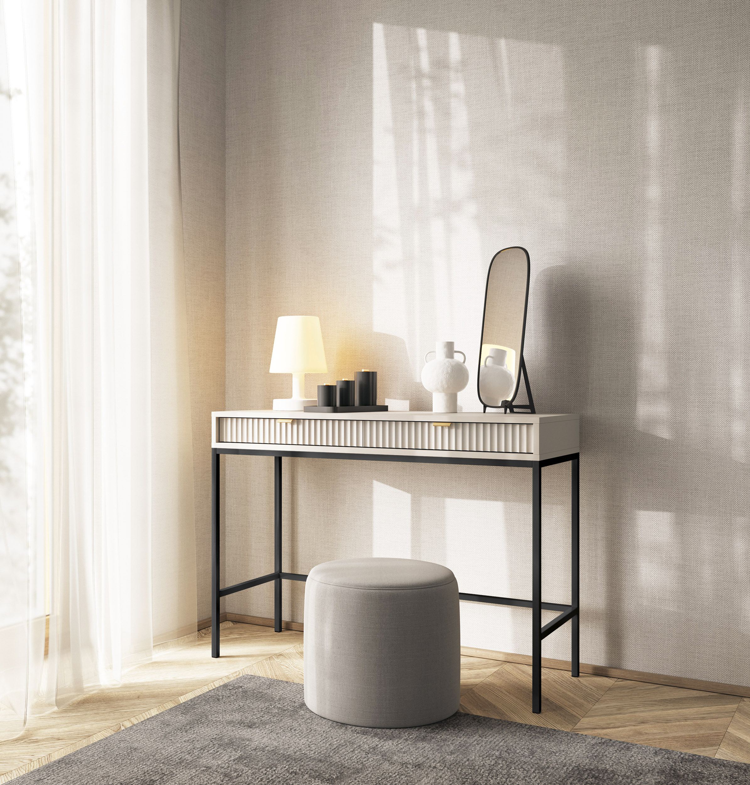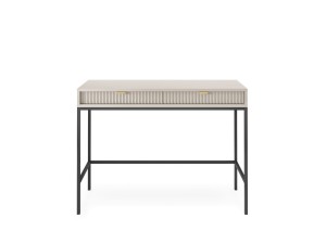Toaletka z szufladami ZANZI sprawdzi się zarówno w nowoczesnych, jak i klasycznych wnętrzach, dodając im wyrafinowanego stylu. Dzięki frezowanym frontom mebel zyskuje dynamiczną strukturę, która odświeża wygląd wnętrza, nadając mu wyjątkowy charakter. Smukłe, wysokie nogi na stelażu nadają toaletce szyku a zarazem ułatwiają utrzymanie porządku.