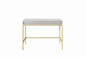 Toaletka z szufladami ZANZI sprawdzi się zarówno w nowoczesnych, jak i klasycznych wnętrzach, dodając im wyrafinowanego stylu. Dzięki frezowanym frontom mebel zyskuje dynamiczną strukturę, która odświeża wygląd wnętrza, nadając mu wyjątkowy charakter. Smukłe, wysokie nogi na stelażu nadają toaletce szyku a zarazem ułatwiają utrzymanie porządku.