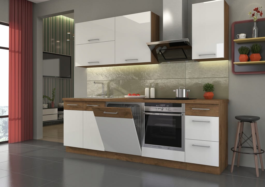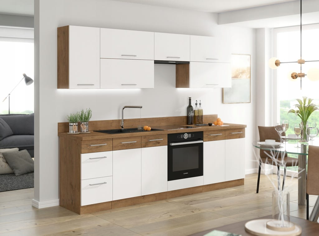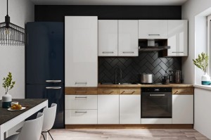 Zestaw mebli kuchennych SARA! 2,4M biały połysk + dąb lancelot