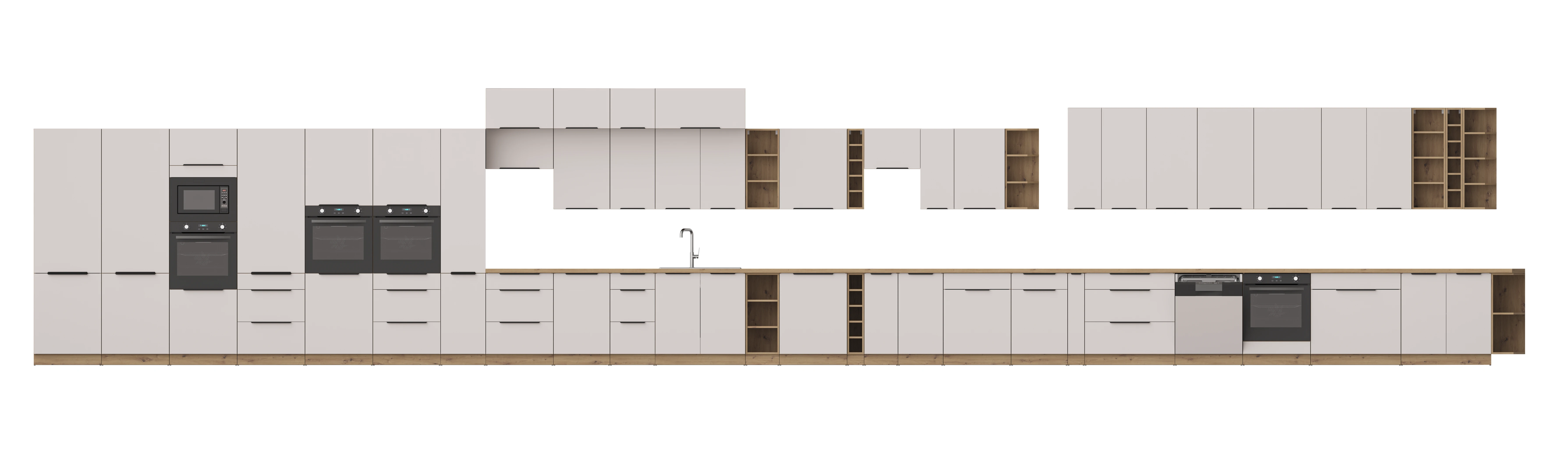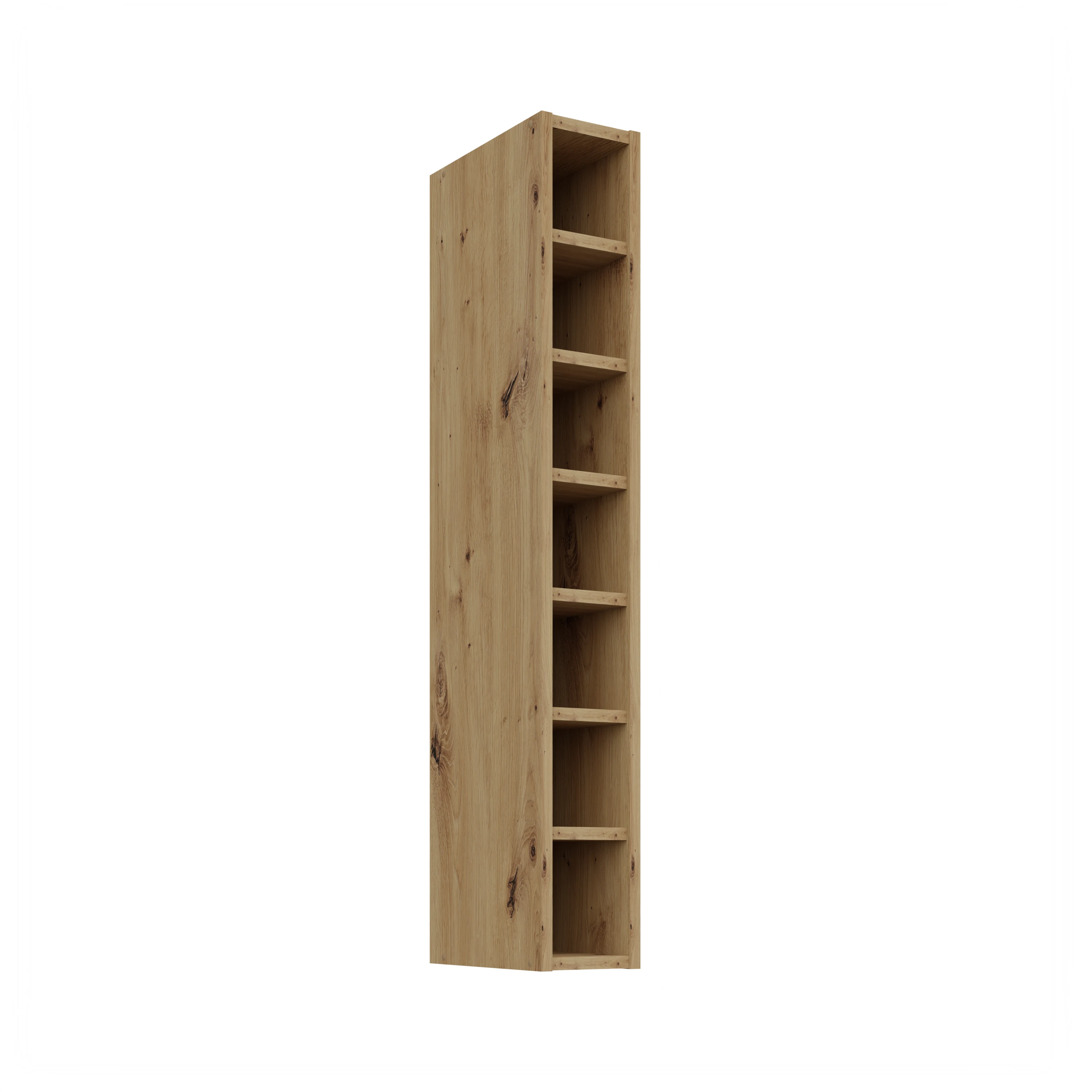 Wyższa wersja otwartej szafki o szerokości 15 cm, idealna do przechowywania wąskich butelek, słoików czy dekoracji. Wykończenie w kolorze Dąb Artisan sprawia, że wnętrze nabiera nowoczesnego, ciepłego charakteru. Otwarta forma pozwala na przechowywanie przypraw, butelek lub elementów dekoracyjnych, które są zawsze pod ręką.